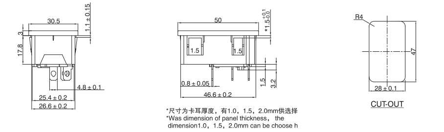 治具插座S-03系列,單插、二合一、三合一保險插座等多種規格,大電流10A ,15A,產品通過UL VDE CCC CB等認證,常見于家用電器,音響功放機等